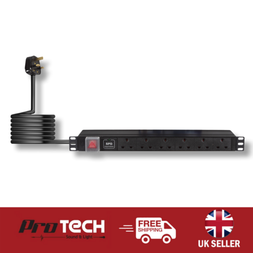 6-Way UK Horizontal PDU with surge protection features six 13A UK socket outlets to a 13A fused UK plug. 1U height and an Illuminated power switch designed for use with the rack cases and network cabinets.
