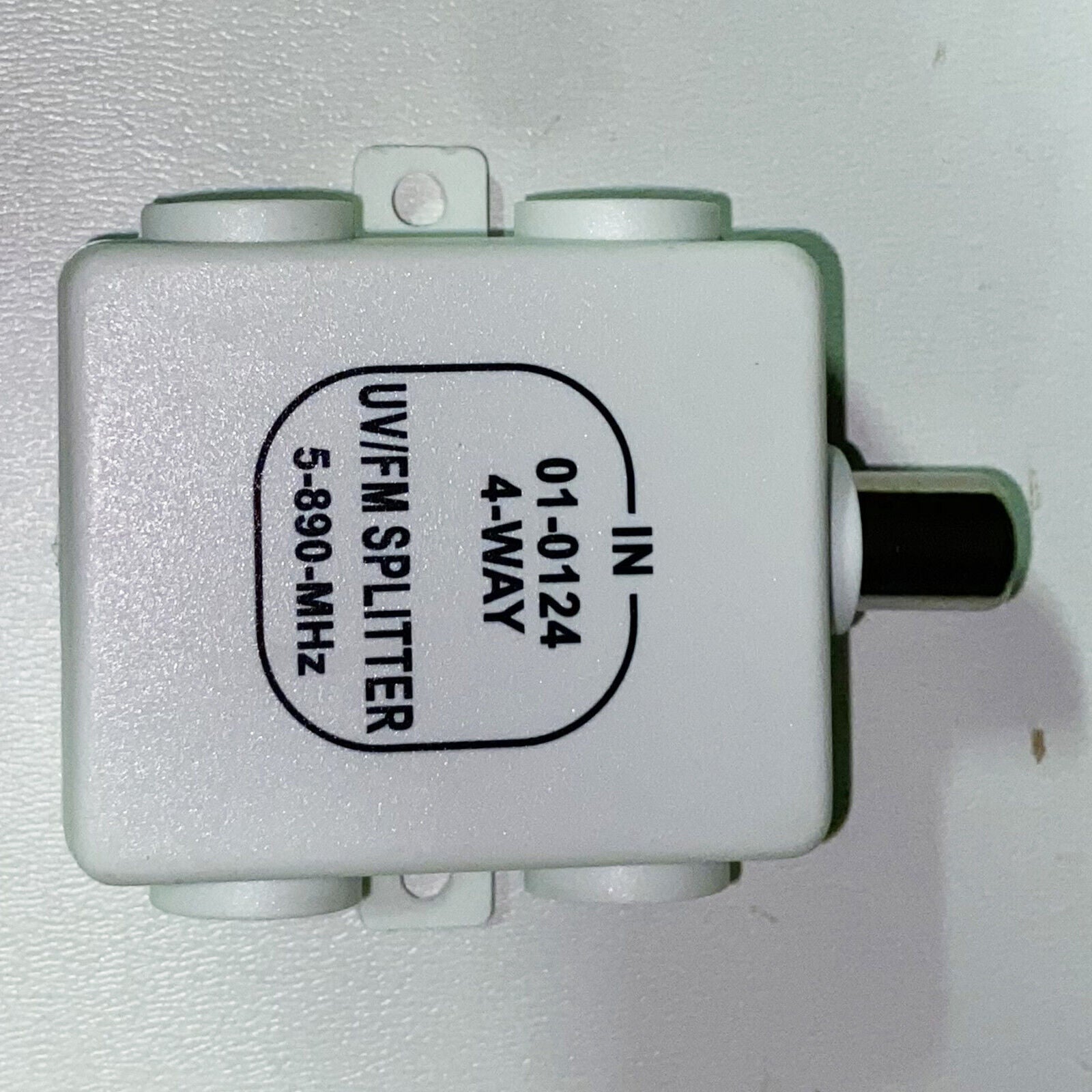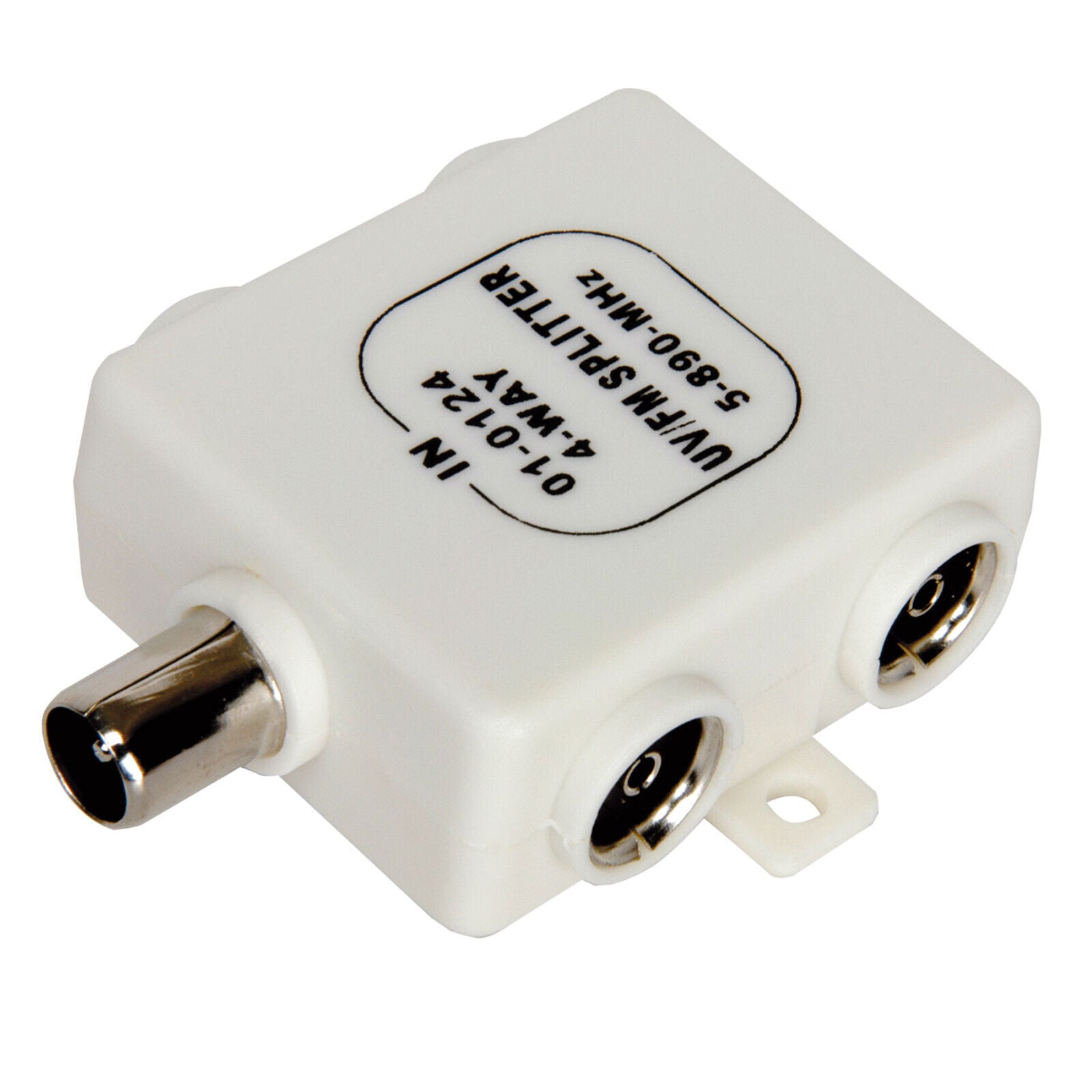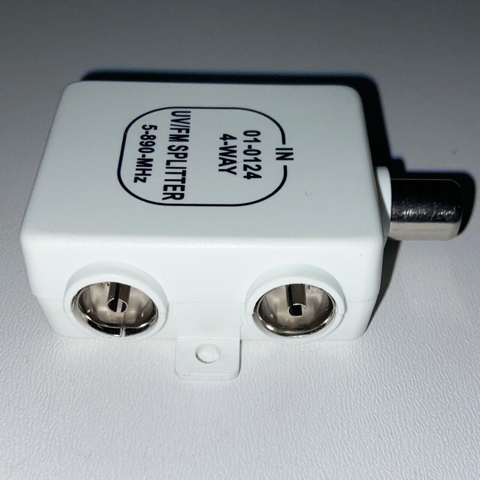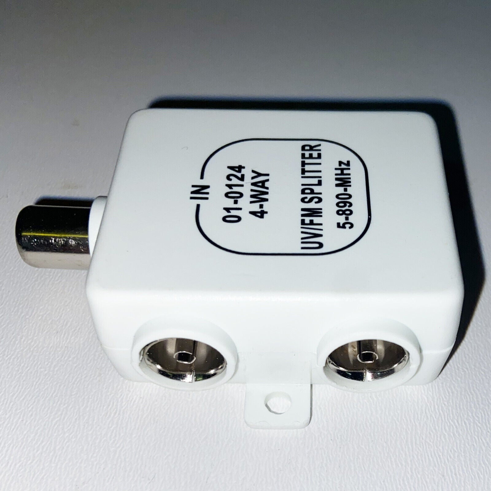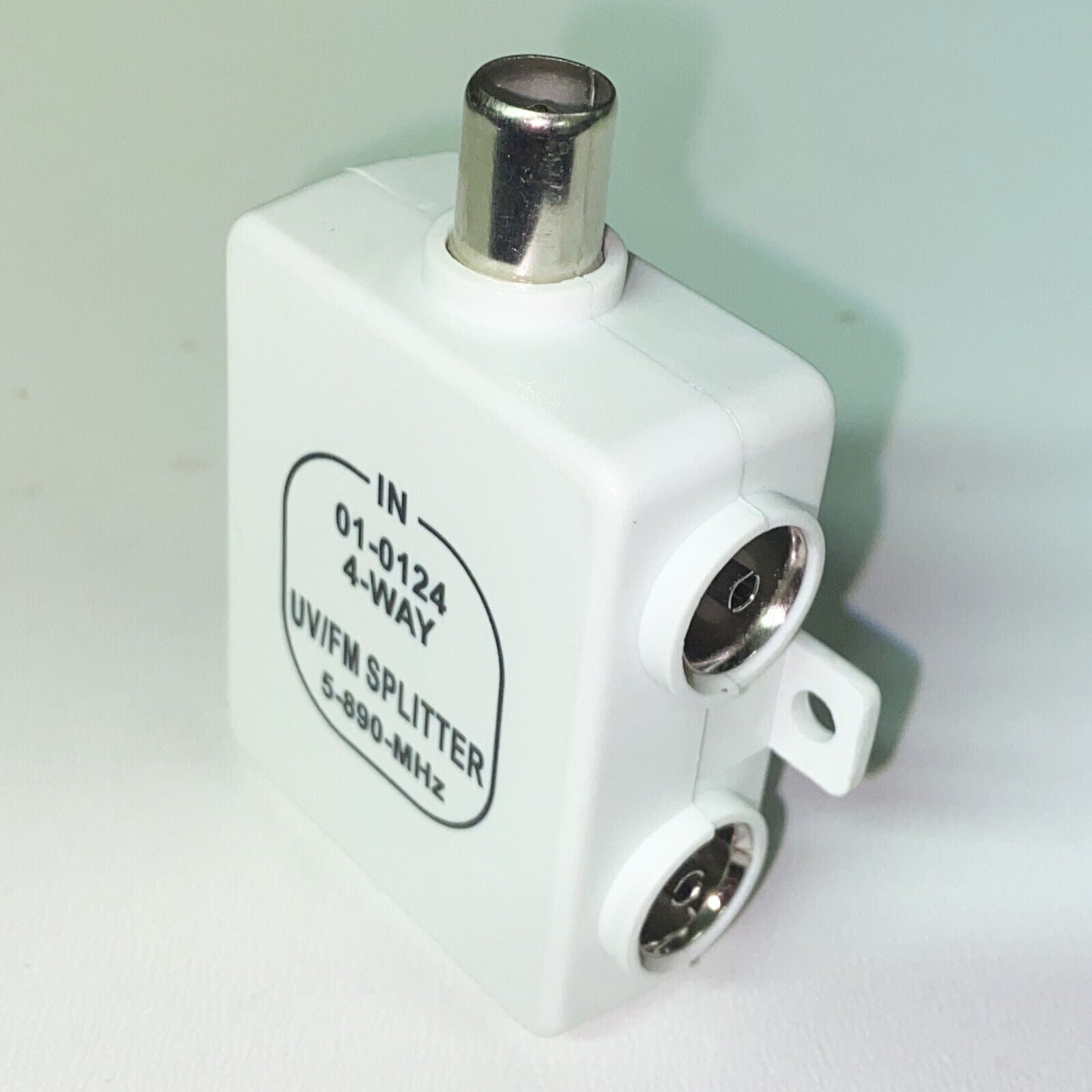 Compact 4-way splitter for wide-band UHF/VHF/FM signals.