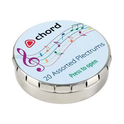 A selection of Chord celluloid plectrums in assorted gauges, supplied in a handy press-to-open tin.