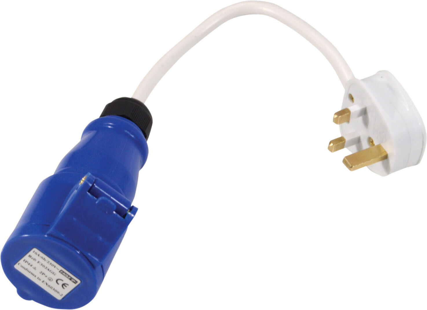High current mains socket to a single 13 A plug. The product features durable connectors and white cable.